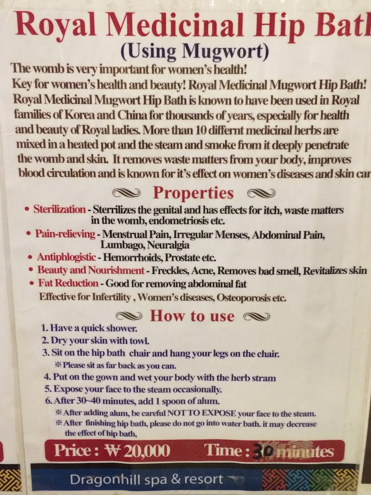 | The healing properties of the botanicals in the pools is written in Korean; the only one I recognize is mugwort and there is plenty of that. |